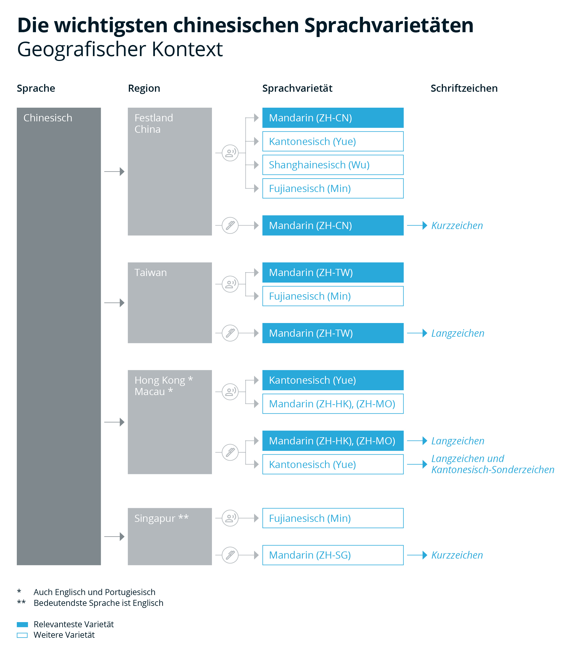* Es werden nur die fünf größten Regionen aufgeführt, in denen Chinesisch gesprochen und geschrieben wird, und nur die vier Sprachvarietäten mit den meisten Sprecher:innen: Mandarin (ca. 955 Mio.), Kantonesisch Yue (ca. 85 Mio.), Shanghainesisch Wu (ca. 80 Mio.), Fujianesisch Min (ca. 75 Mio.). Es gibt weitere Sprachregionen, z. B. in Südostasien. Sprach-Codes