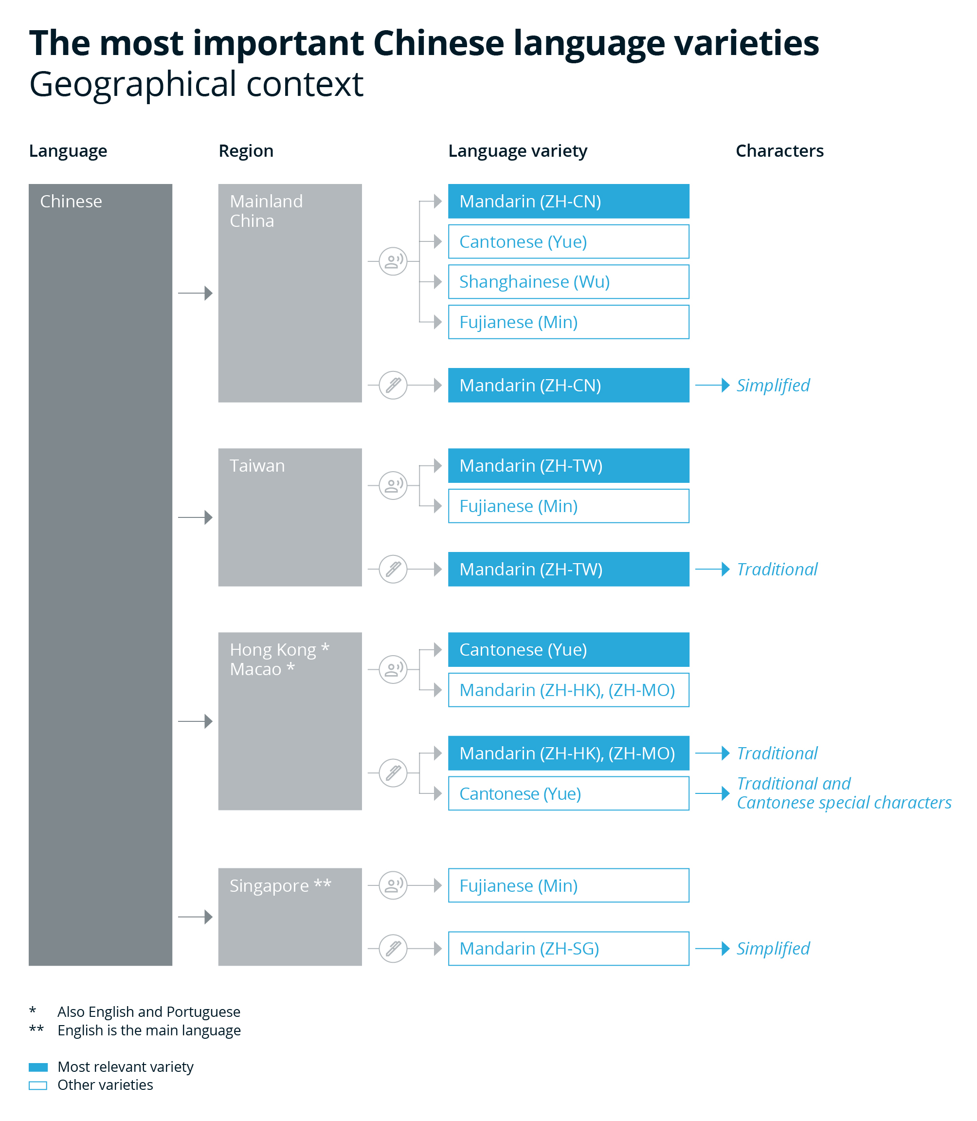 To provide an overview of these relationships, we have developed a diagram together with our Chinese language experts. It shows the most important Chinese varieties in a geographical context and distinguishes between spoken and written language.*
