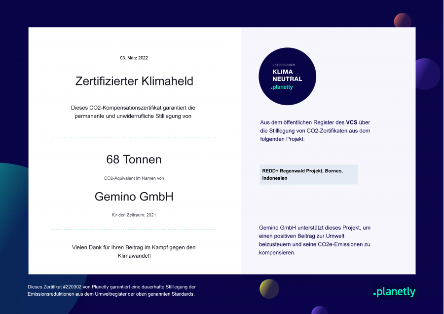 Für Gemino sind die Themen Klimaneutralität und nachhaltiges Wirtschaften immer schon von großer Bedeutung gewesen. Und sie bestimmen unseren bewussten Umgang mit Ressourcen: von der LED-Leuchte über Reiserichtlinien bis hin zu Ökostrom für unsere Büros und unsere gehosteten Server.